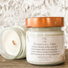 Aromatherapy self-care candle for happiness. Made from 100% natural vegan soy wax and featuring a crackling wood wick. Perfect gift for anyone who loves scented candles and hidden crystal gemstone reveals. Each candle will contain a mystery crystal.
