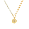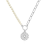 Let your light shine. This versatile and stylish necklace showcases a crystal stone surrounded by delicate rays. Hung from a chain that is half glass pearls and half staple chain, this necklace makes a modern yet classic statement.