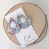 These handmade, double-sided earrings are absolutely beautiful. A bright watercolour type floral pattern on a blue background, with a black cork backing.